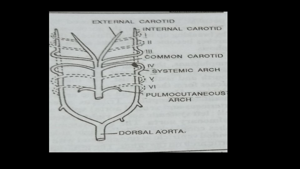 In Anurans : • At metamorphosis, with loss of gills, first, second and fifth aortic arches disappear all together. • Thus three pairs of aortic arches [third, fourth and sixth] are fuctional in general. • Carotid arch takes oxygenated blood to head region. • Systemic arch on each side continues to dorsal aorta to distribute blood elsewhere except head and lung. • Pulmonary arch supplies venous blood exclusively to lungs for purification. • The ductus caroticus and ductus arteriosus are usually absent.