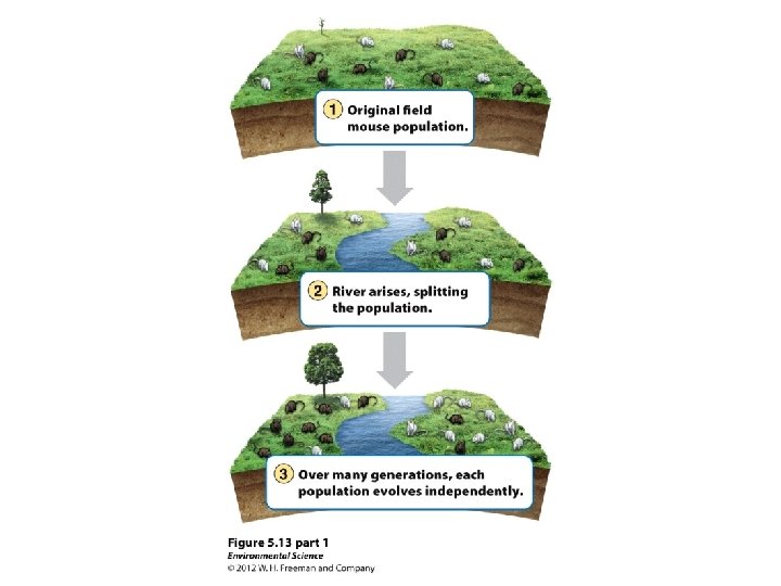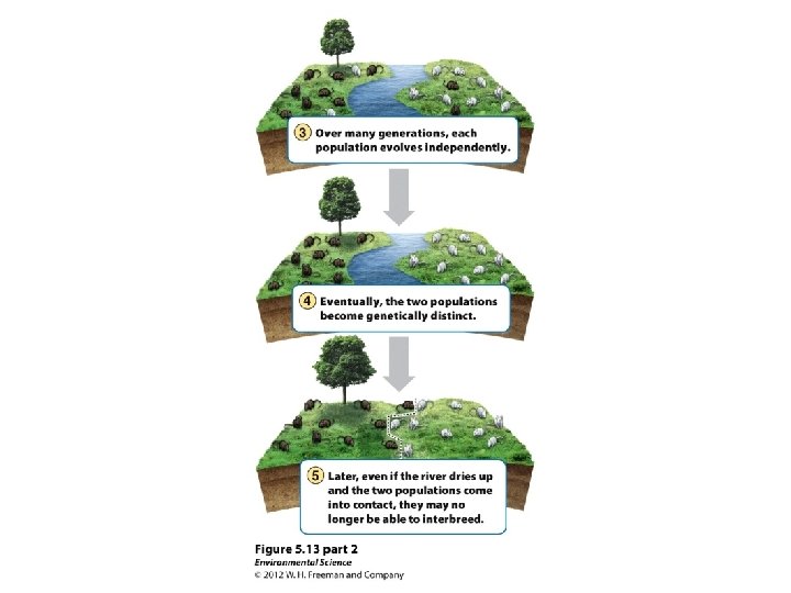 Geographic Isolation: separate due to a geographical barrier. Allopatric Speciation: geographic isolation forces two species to adapt differently. Eventually they cannot breed.