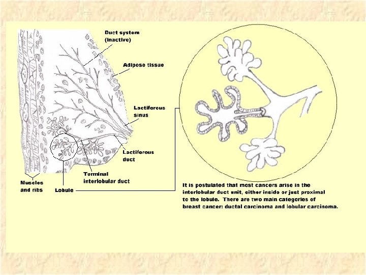 Anatomy of Breast and Ducts • 95% of breast cancers develop from cells lining the breast milk ducts.