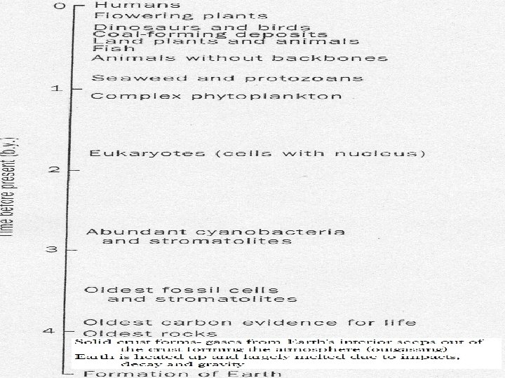 Most organisms decompose or are eaten after they die, so only a small percent leave fossils Fossils found in Africa suggest that we have evolved over the past 4 million years from apelike animals This is only about 1/10 of 1% of Earth’s age Humans are a very recent life-form