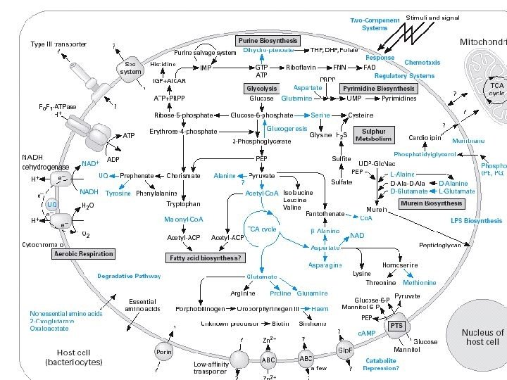 Types of genes which Buchnera lack n n DNA repair enzymes cell wall synthesizing enzymes involved in phospholipid synthesis components of signaling pathways Types of genes which Buchnera have n n certain amino acid synthesis certain vitamin synthesis ATP synthase ETC