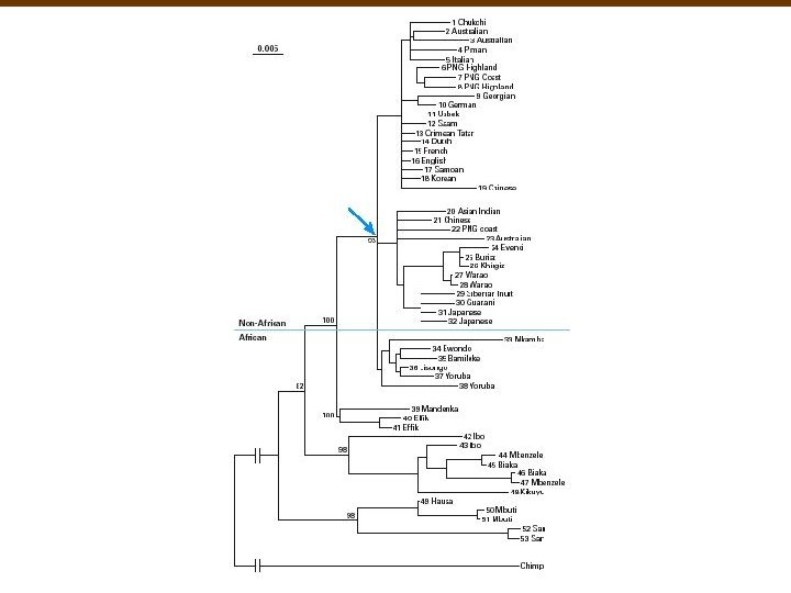 Where and when did modern humans evolve? One theory: “recent Africa hypothesis” predicts African origin 100, 000 -200, 000 years ago. n Another theory: “multiregional hypothesis” predicts a gradual evolution at sites around the world. Genomic data from mitochondria (16, 500 bp) were compared between people from diverse locations. A phylogenetic tree reveals how long it has been since African and non-African populations converged. The MRCAs for various populations can be determined n