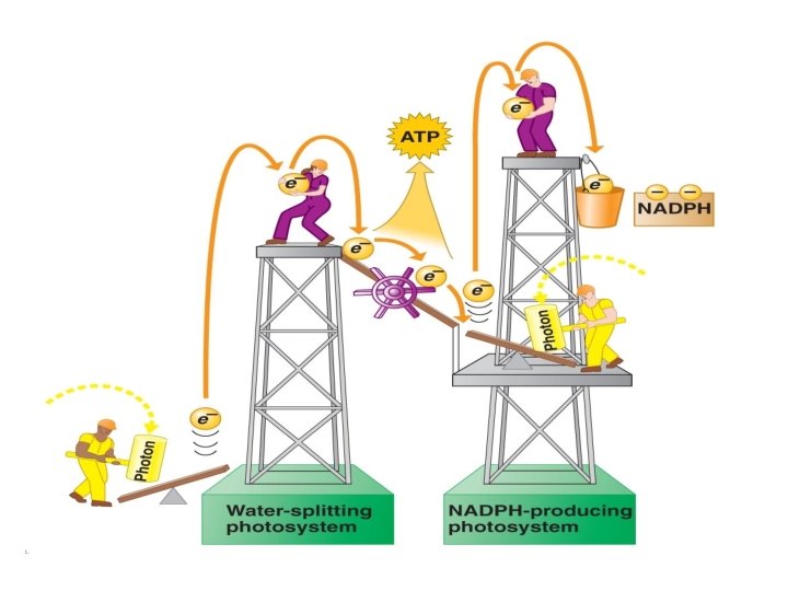 • • • Photons excite water-splitting photosystem (PS II), then are trapped by an electron acceptor Light-excited electrons taken from H 2 O, so H 2 O oxidized into O and H+ Energized electrons from PS II pass down electron transport chain to PS I (NADPH producing photosystem)