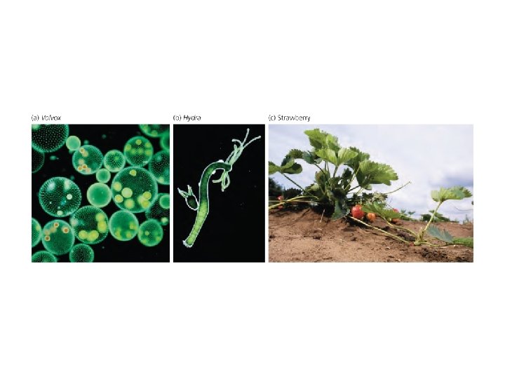 A hydra. This individual is reproducing both sexually and asexually. The crown of tentacles at the upper left surround the hydra's mouth. Along the body below the mouth are rows of testes. Below the testes are two asexual buds. Asexual Reproduction also rarely observed in fish and reptiles