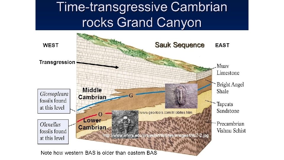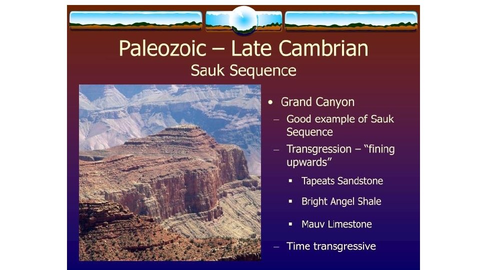The Great Cambrian Transgression • Shoreline migrated inland in North America, east to west • Observed in the Grand Canyon strata