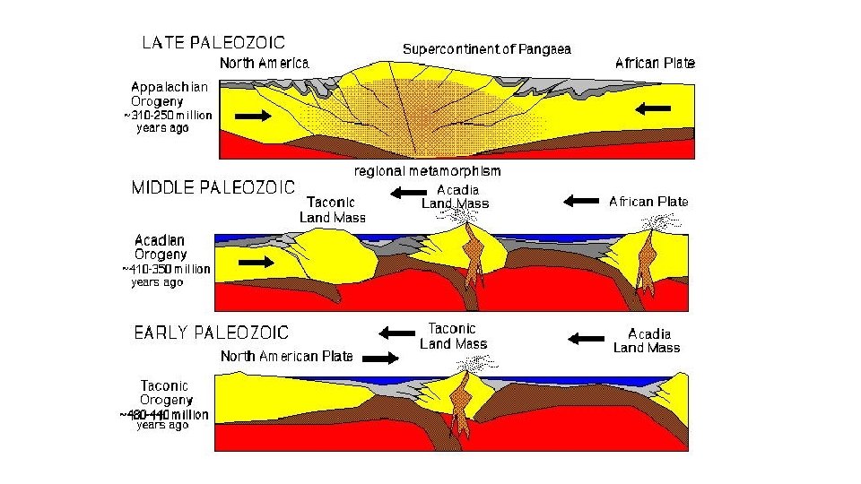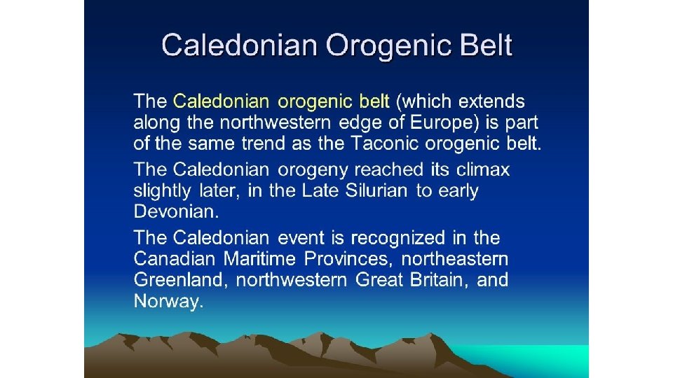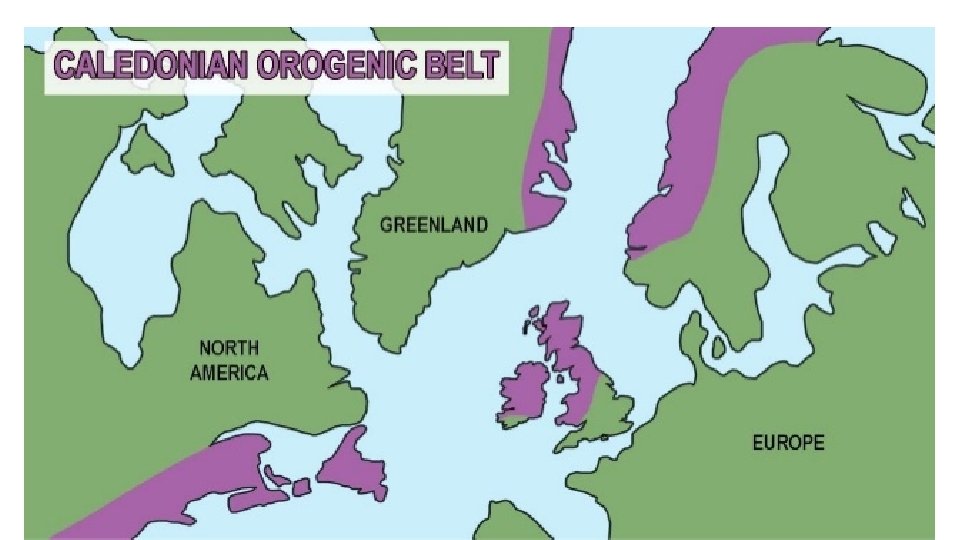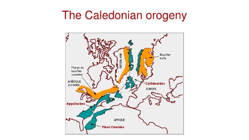 Phases of the Caladonian Orogeny • East Greenland Orogen, formed from Cryogenian Neoproterozoic to Devonian • Taconic phase – A mountain building period that affected most of New England in the NE U. S. and Canada during the Ordovician Period. • Acadian phase in the Eastern U. S. during Silurian and Devonian Periods.