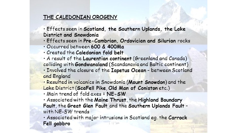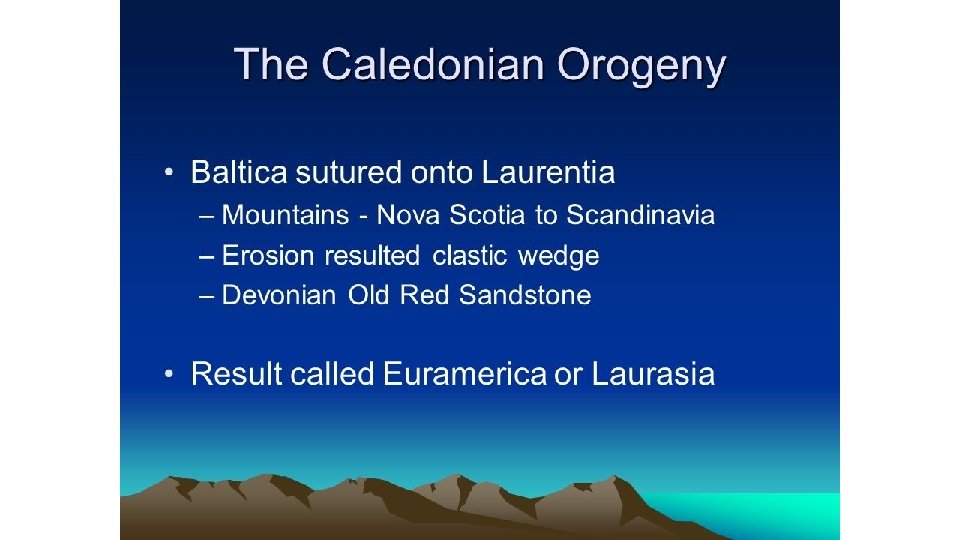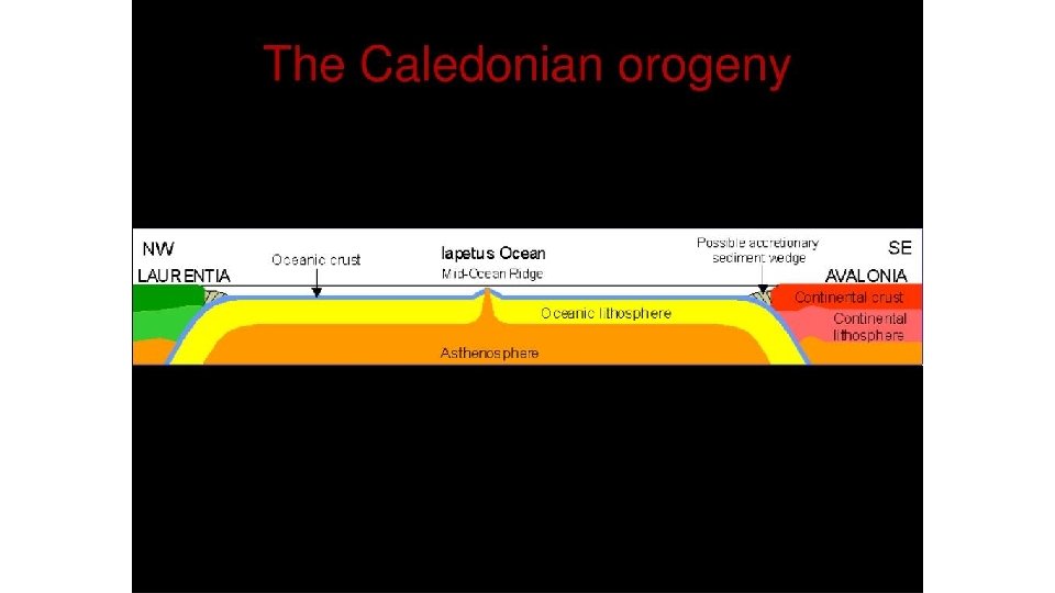 Caladonian Orogeny: 490– 390 million years ago • Caused by the closure of the Iapetus Ocean when the continents and terranes of Laurentia, Baltica and Avalonia collided