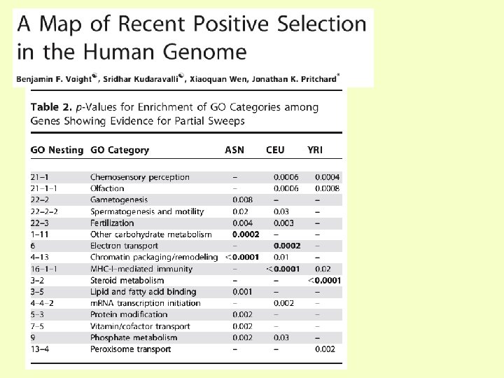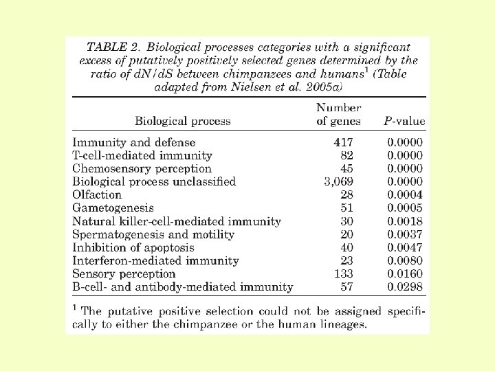Genome-wide analyses of protein sequence evolution • Most-significant categories showing positive selection in human lineage include: *Immune system: parasites and pathogens *Reproduction: genes expressed in reproductive tissues *Nervous system genes: expressed in brain *Amino-acid metabolism: diet Olfaction: sense of smell Development: such as skeletal Hearing: for speech perception