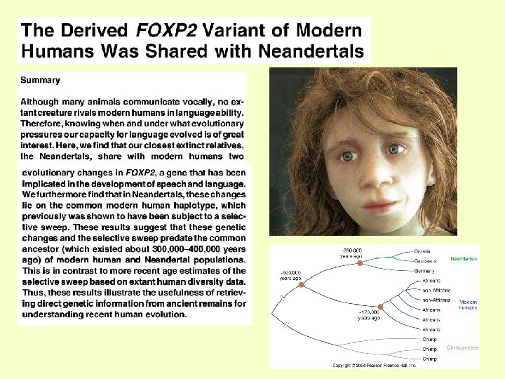 FOXP 2: Molecular Evolution • FOXP 2 is highly conserved throughout mammals and beyond but for three nucleotide substitutions that change the FOXP 2 protein between humans and the mouse, and two have occurred along the human lineage • Examination of human genetic variation suggests that the region surrounding the gene underwent a selective sweep in the past 200, 000 years
