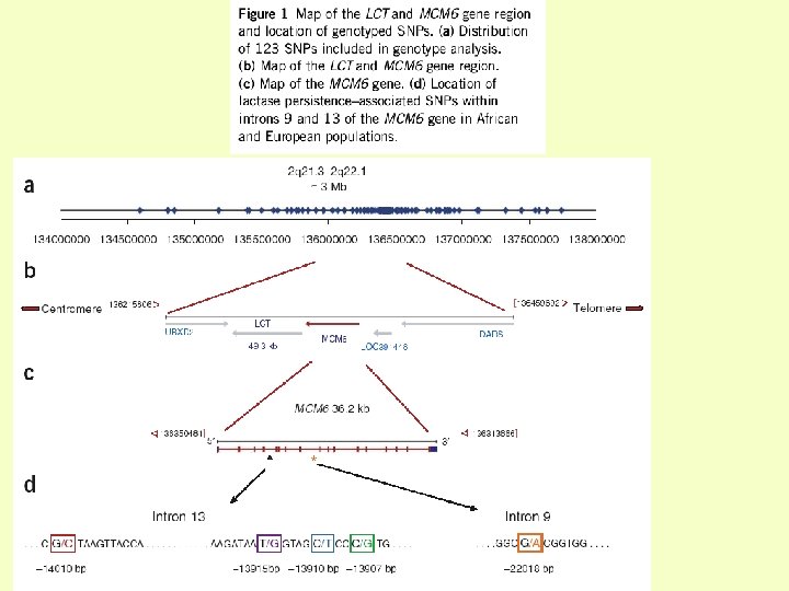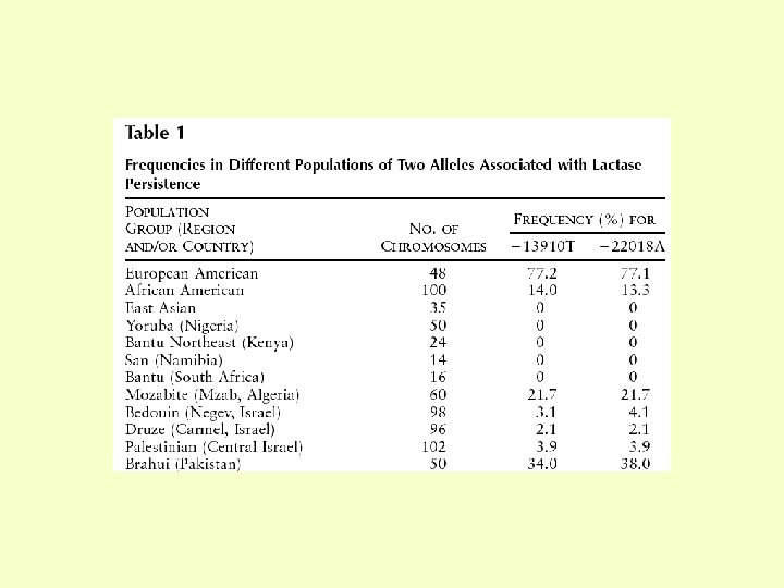 Molecular basis of lactase persistence • Lactase level is controlled by a cis-acting element • Linkage and LD studies show association of lactase persistence with the T allele of a T/C polymorphism 14 kb upstream of the lactase gene Enattah et al. (2002) Nature Genet. 30, 233 -237