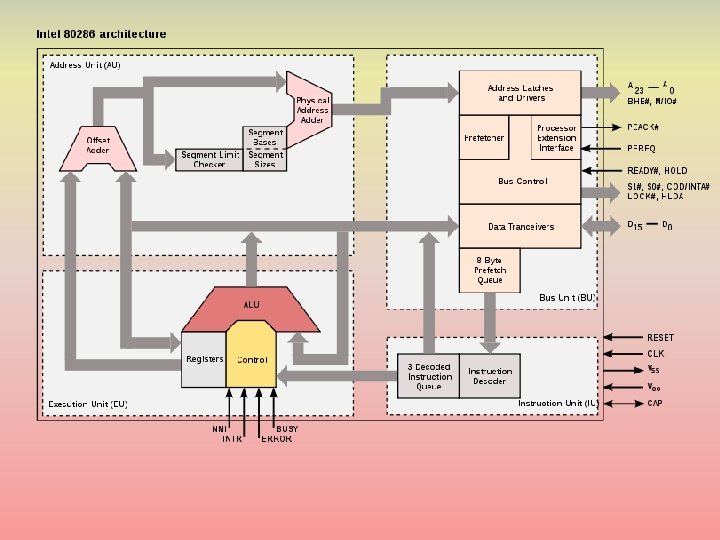 Evolution of the Intel Architecture • 8086 released in 1978, ranged between 4 -10 MHz – 16 bit architecture which grew out of the earlier 8008 and 8080 architectures • mostly backward compatible with 8008, 8080 and 8085 – 20 -bit address space by • left shifting segment register 4 bits to be a 20 -bit base and adding index register as an offset – integer only, signed and unsigned • microcoded multiply and divide operations – CPU had 40 pins whose uses overlapped based on clock cycle • see next slide • pins and address/data bus are multiplexed (address during first cycle, data during second – fourth cycles) – floating point available by adding 8087 coprocessor
