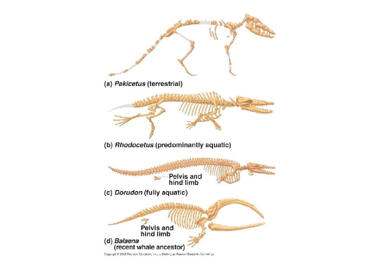Whale Transition • Fossils: Pakistan, Egypt, North America • Four-legged terrestrial ancestors Whales • Hind limbs: Legs Vestigial bones • Front limbs: Legs Flippers • Ankle bones: Similar to hippos & relatives