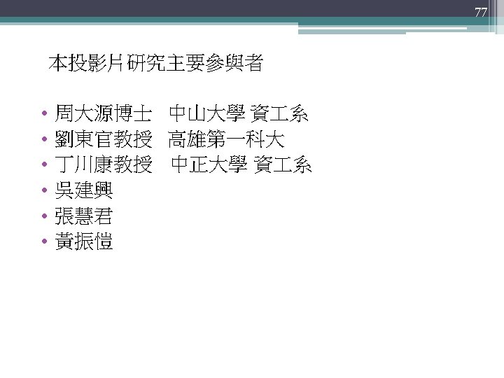 76 Conclusions • Have introduced an evolutionary of the variablelength multi-objective genetic algorithm • Have presented the applications of MOGA and VLMOGA - Flight scheduling - The multiple constraints heterogeneous wireless transmitter placement