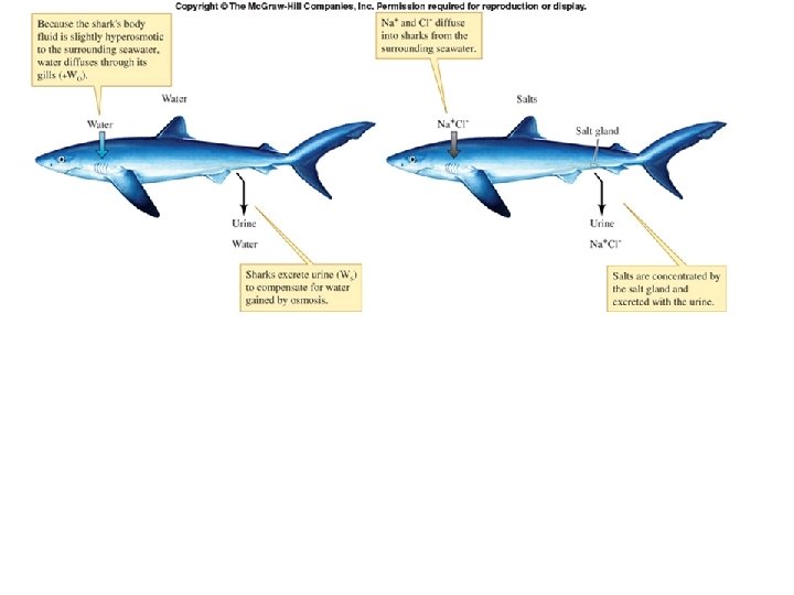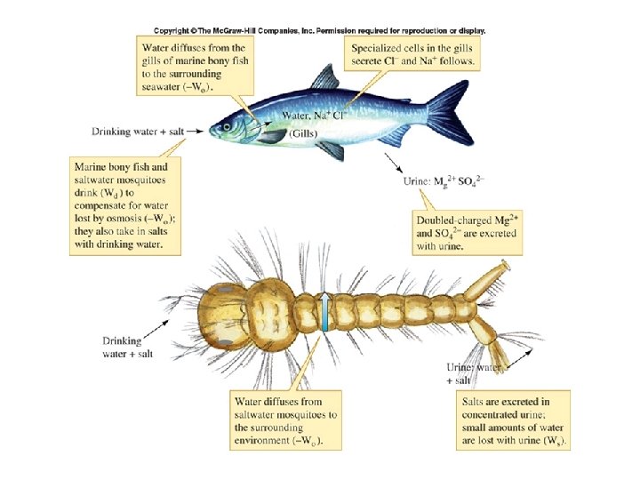 • Osmoregulatory Mechanisms – Body fluids are 18 0/00 S – In seawater • H 2 O loss by osmosis (scales help reduce this) • Organism drinks seawater • Salt is excreted by chloride cells in gills (active transport) • Kidneys produce small quantities of salty urine – In freshwater • H 2 O gain by osmosis (scales help reduce this) • Salt absorbed by chloride cells in gills (active transport) • Kidneys produce large volumes of dilute urine