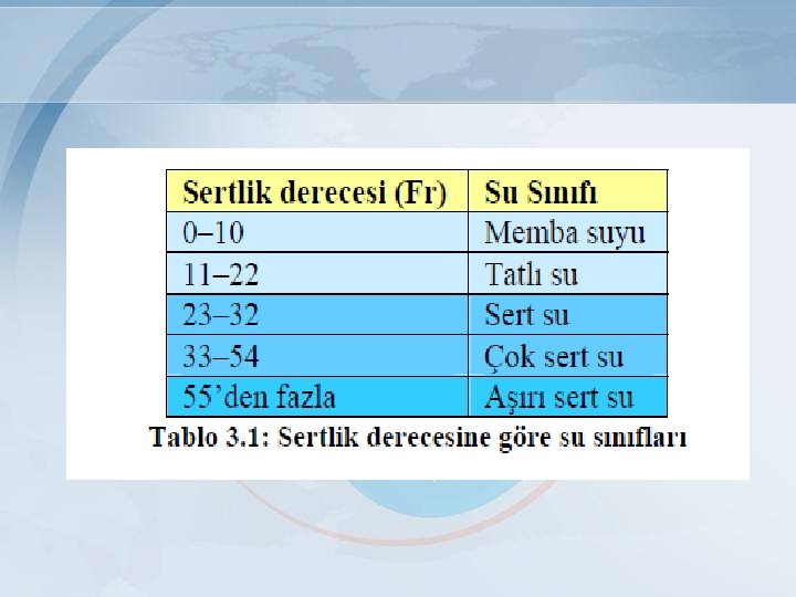 KİMYASAL ÖZELLİKLER a) p. H Değeri: Saf su p. H = 7 p. H > 7 Bazik p. H < 7 Asidik b) CO 2 : Fazla miktarda CO 2 içeren sular korozyona sebep olur. c) Sertlik : Kalsiyum(1000 mg) ve magnezyum(200 -400 mg) tuzları sulara sertlik verir. En çok kullanılan “Fransız Sertlik Derecesi” 1 Fr = 10 mg Kalsiyum ve Magnezyum bikarbonata eşittir.