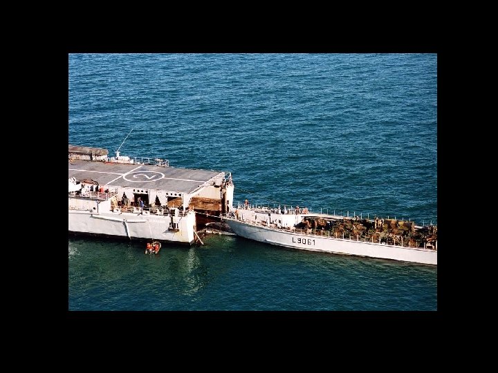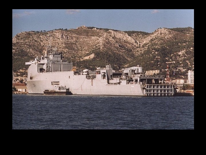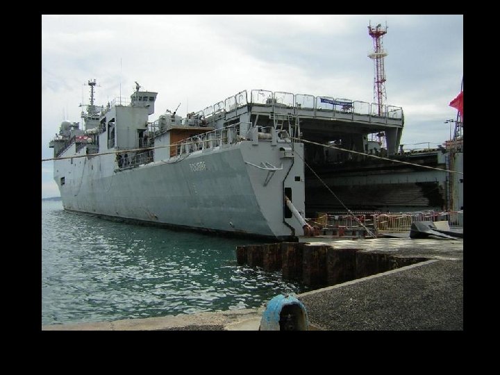 El casco está construido alrededor de una cuenca interior, el suelo , que se extiende por las tres cuartas partes de la longitud de la nave. Está previsto llevar a cabo el desembarco de tanques y vehículos que utilizan lanchas de desembarco diferentes. ¿Cuáles son las funciones de transporte y el desarrollo de estos oeuvre barcazas que determinan en esencia la estructura de la nave. Durante el tránsito al teatro, las barcazas fueron transportados a secar el piso. La implementación se lleva a cabo después de barcazas empujadas por lastrar la nave, el relleno de la planta y abrió la puerta trasera de la División de Cooperación Técnica. El lastrado y deslastrado se llevan a cabo a través de cuatro bombas de 4. 000 m 3 / h de forma remota desde una estación central y el suministro de un total de 26 balastos. Las válvulas se controlan a distancia. Lastrado instalaciones están diseñadas para permitir a las siguientes actuaciones: - el edificio es el desplazamiento a plena carga, sin carga, el suelo puede estar inmerso en unos 30 minutos, - los balastos el suelo se sumerge y se llena, se puede vaciar en 45 minutos - en una situación de balasto, el nivel del agua en el suelo es de 3 m. El puente móvil puede ser utilizado como una zona de aterrizaje secundaria, o como estacionamiento para vehículos. Los paneles se instalan en su pista con la grúa. Ellos se quitan cuando se quiere enradier proyecto vasos profundos de aire. El barco fue diseñado para facilitar la circulación de vehículos. Un ascensor sirve 52 toneladas y en el suelo, los vehículos de hangar, puentes móviles, el aparcamiento en el techo de la nave y el lado de la rampa la puerta del vehículo. 1 - Embarque de grandes barcazas blindados para el transporte materiales inmersos en el suelo. Las barcazas se transportan en el suelo durante el transporte del edificio. 2 - Vehículos de carga de rampa lateral a través de la puerta del ascensor y servicio de los parking de almacenamiento de vehículos. 3 - Embarque a partir de un muelle por la puerta de la huelga y levantar o mediante una grúa de 37 toneladas.