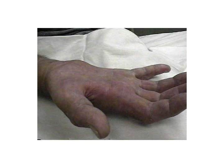 HANDS § Cyanosis § Clubbing---ca. bronchus ---TB ---empyema ---abcess ---fibrosing alveolitis ---bronchiectasis § Wasting of small muscles of hand ---pancoast tumour