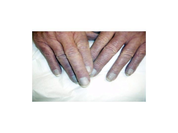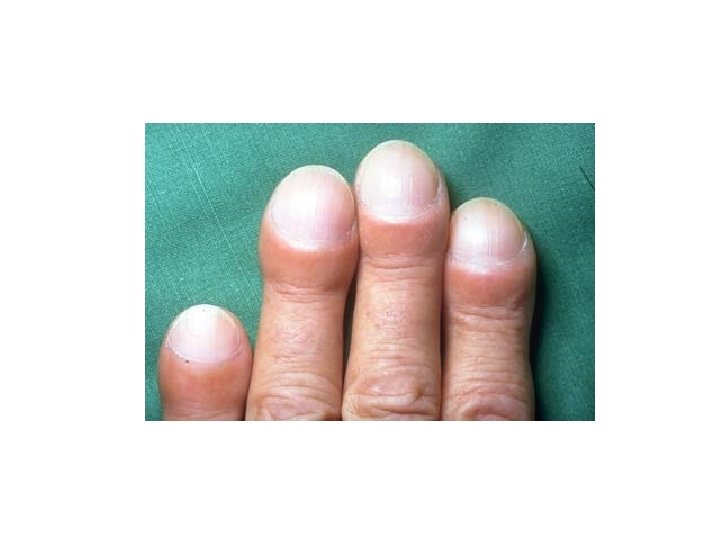 GENERAL EXAMINATION CYANOSIS § Central § Peripheral causes § COPD § Type 2 resp. failure § Pulmonary fibrosis § B. asthma § Congenital cyanotic heart disease § Pulmonary embolism