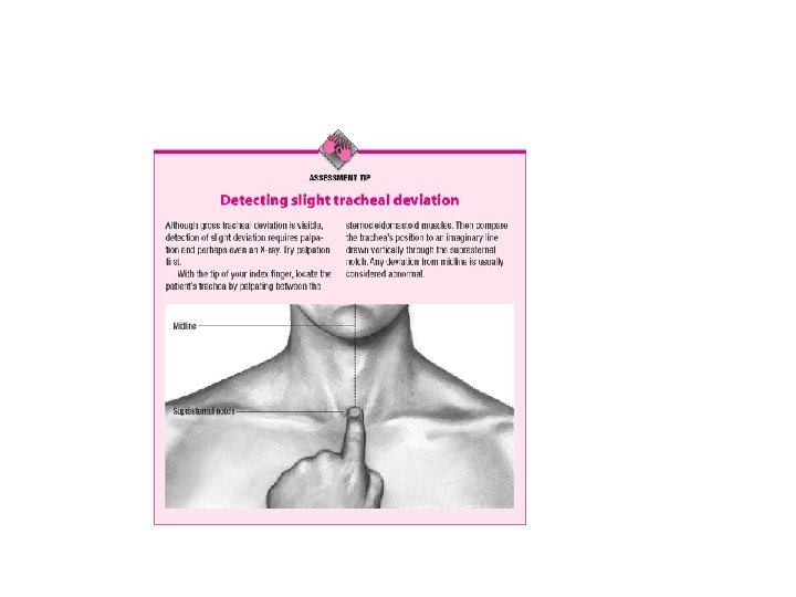 Palpation Trachea 4 -5 cm of the upper trachea can be felt in the neck between the cricoid cartilage and the sternal notch. § Pushed –pneumothorax -pleural effusion § Pulled—fibrosis --collapse