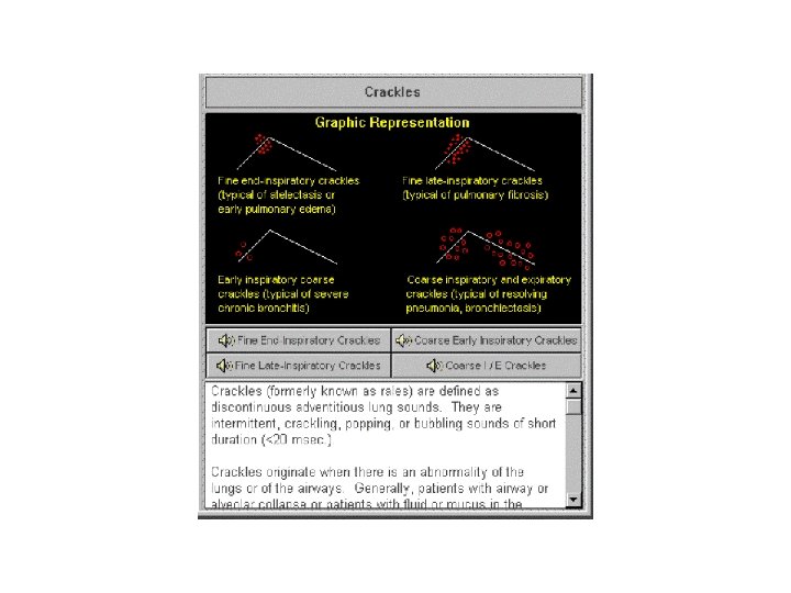 Added sounds § Crepitations---fine ---heart failure --fibrosing alveolitis ---coarse—bronchiectasis --infections § Wheezes or rhonchi---COPD --bronchial asthma