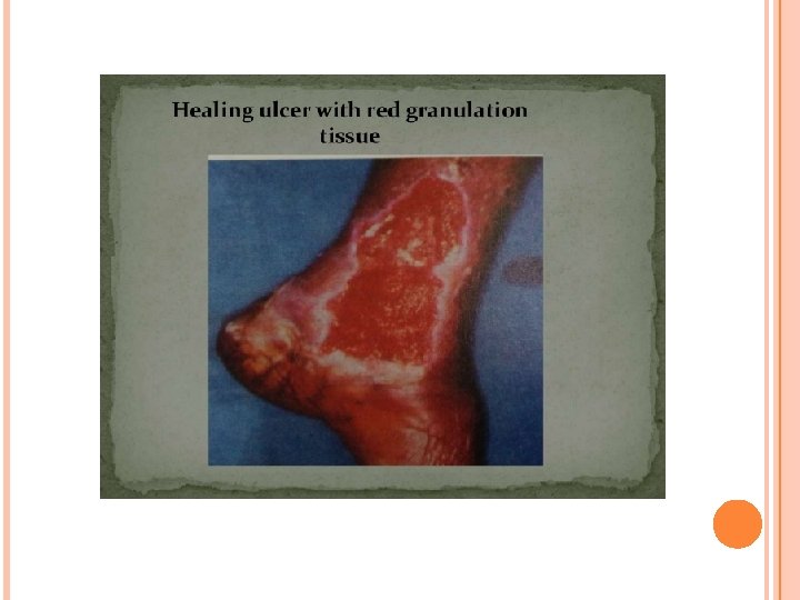 Floor: • This is the exposed surface of the ulcer. One must be very careful to note what isthere at the floor of an ulcer. When floor is covered with red granulation tissue, the ulcer seems to be healthy and healing. Pale and smooth granulation tissue indicates a healing ulcer. Wash leather slough on the floor of ulcer is pathognomonic of gummatous ulcer. A black mass at the floor sugggests malignant melanoma. • •