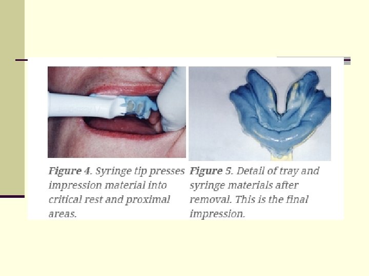 n When taking impressions for partial dentures, Accu-Dent System 2 is used. The materials and trays are formulated differently for this system, and an additional syringe tip is provided for the delivery system, which greatly assists accurate placement of the syringe material over the occlusal surfaces of the natural dentition. This feature captures exceptional detail of rest preps and proximal surfaces of teeth for accurate framework fabrication 3 (Figure 4). The tray material is then placed in a way similar to Accu-Dent System 1, and both tray and syringe material merge upon seating (Figure 5). In addition to partial denture impressions, we find Accu-Dent System 2 particularly useful for immediate dentures and athletic mouth guards.