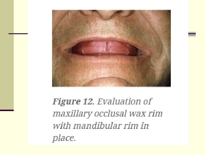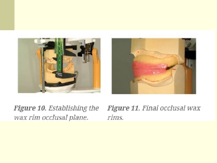 SECOND APPOINTMENT n n When tried in the patient’s mouth, the preliminary mounting of the casts ensures the dentist that the wax rim occlusion will be very close to that of the Centric Tray registration taken in appointment one, significantly reducing valuable chair time. In addition, the dentist and the technician have an opportunity to evaluate the vertical dimension, jaw relationship, preprosthetic surgery considerations, implant options, etc, early into the treatment. Once again, while the existing dentures are in the mouth, place a pen dot on the tip of the nose and chin of the patient. Add or subtract to this measurement if necessary to reestablish the desired vertical that was established in appointment one. Remove the existing dentures and place the upper occlusal rim in the mouth. Check for proper lip support and incisal length. You may use a Fox plane to ensure a correct interpupillary line and alatragus line (Campers plane).