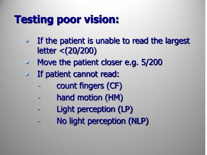 Near Visual Acuity • Testing the VA at close range (usually 40 cm) • Near visual acuities are taken through the habitual correction • The purpose is to detect people with near vision difficulties (e. g. , uncorrected high hyperopia, accommodative dysfunction) • In patients over 40 years old, the reduced near visual acuity is one of the symptoms of presbyopia