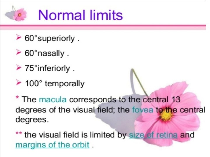 Visual Acuity Standard Test Disances : • Distance visual acuity (DVA) – 20 ft or 6 M is equivalent to optical infinity • Near visual acuity (NVA) - 40 cm • Why 6 M / 20 ft – because rays beyond 6 M are parallel and we should consider the parallel rays come from infinity • Why 40 cm – because near point of eye is 40 cm