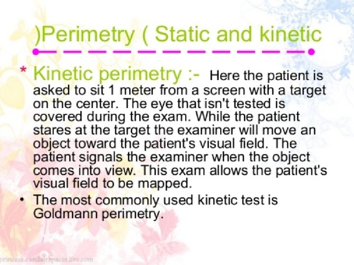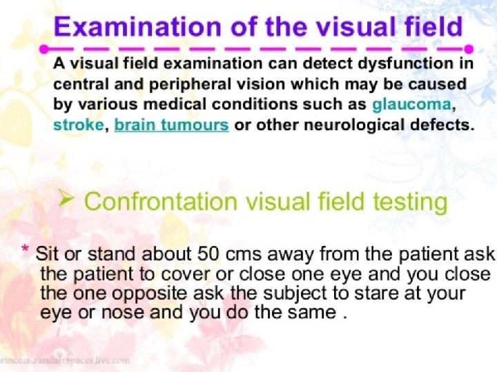Colour vision test • Different charts • Common one is Ishihara chart • Three basic colour red/ green/ blue for bedside test.