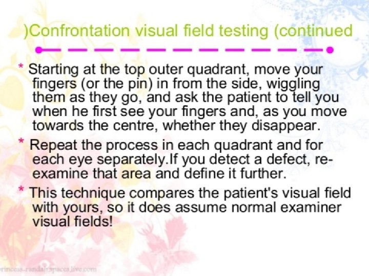Requirement : • • • Illuminated vision chart 6 M/ 20 FT distance Individual eye should be tested separately First unaided, then with pinhole If patient wear spectacle then unaided, then with spectacle, then spectacle and pinhole.