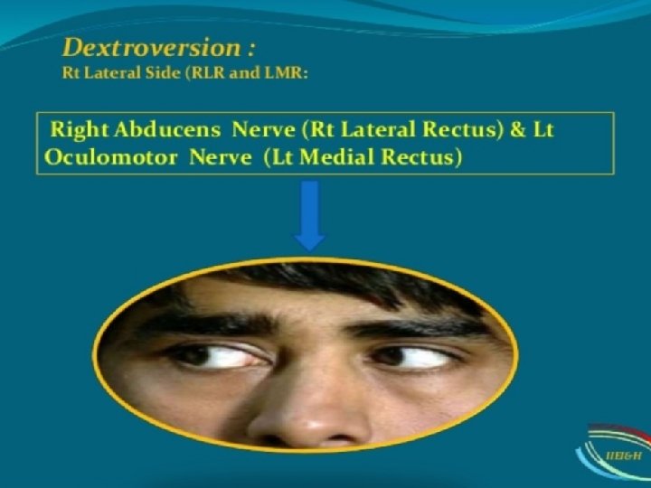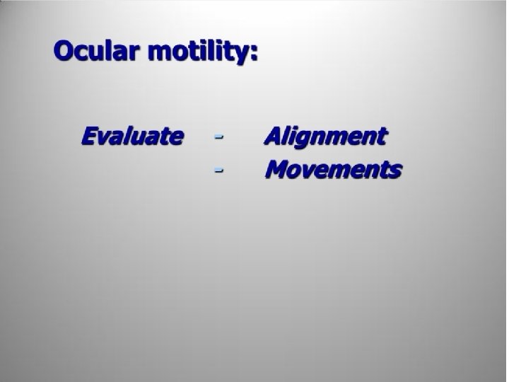 Ocular movements : Ø Duction – monocular movements, are abduction, depression, elevation, depression. Ø Version – binocular movements, are dextroversion, levoversion dextrodepression, dextroelevation, , levodepression, levoelevation. These are the cardinal positions of gaze