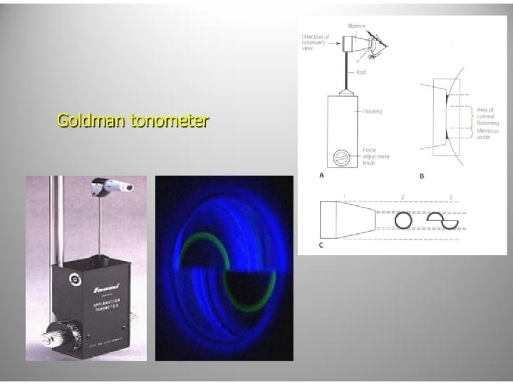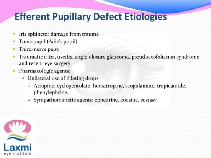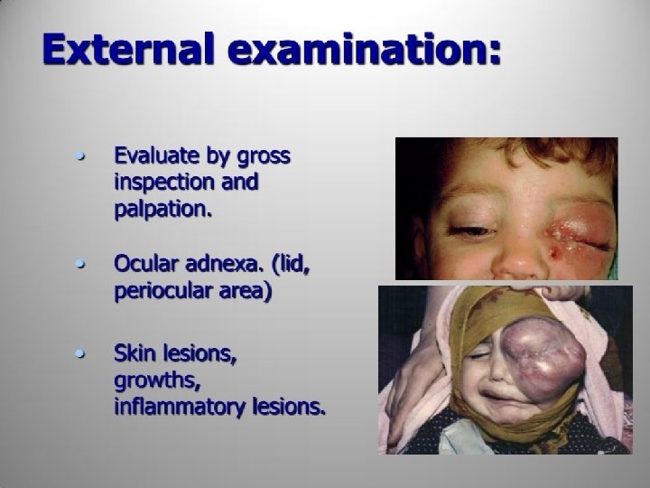 Structures evaluated by slit lamp: • • Eyelid and lashes Conjunctiva Cornea Anterior chamber Irish Pupil Lens