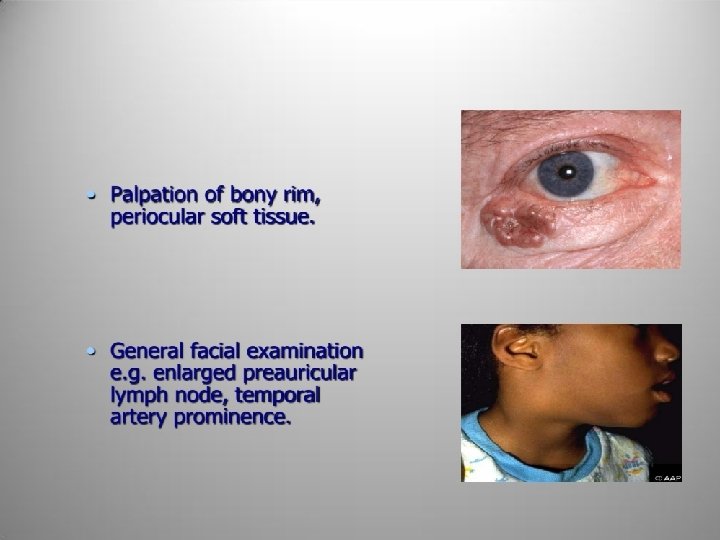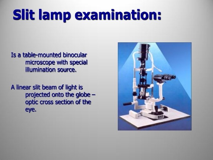 Slit lamp examination • • Lid and lashes Conjunctiva Cornea Anterior chamber Pupil Irish lens
