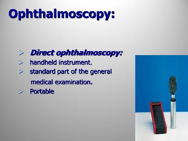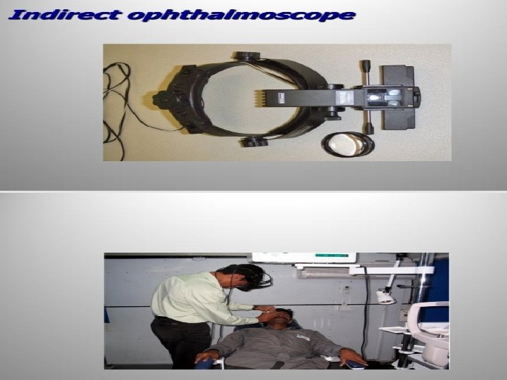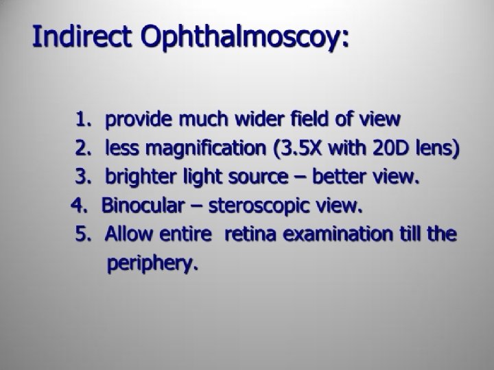 Advantage : 1) Binocular view 2) Larger area can be seen Disadvantage : 1) Inverted and laterally reversed image 2) Bright light is uncomfortable to the patient 3) Need more expert person