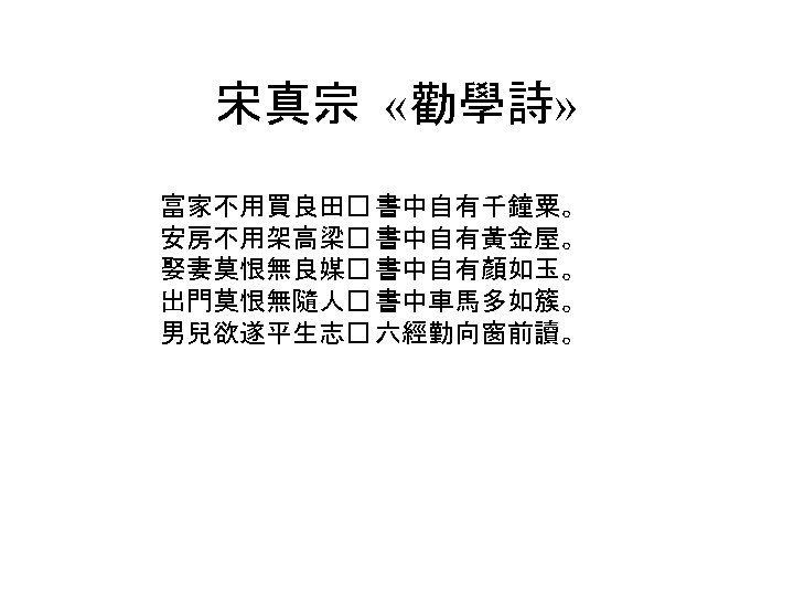 To be wealthy you need not purchase fertile fields, Thousands of tons of corn are to be found in the books. To build a house you need not set up high beams, Golden mansions are to be found in the books. To find a wife you need not worry about not having good matchmakers, Maidens as beautiful as jade are to be found in the books. To travel you need not worry about not having servants and attendants, Large entourages of horses and carriages are to be found in the books. When a man wishes to fulfill the ambition of his life, He only needs to diligently study the six classics by the window. Song Zhenzong (Songs tredje kejsare, r. 997 -1022)