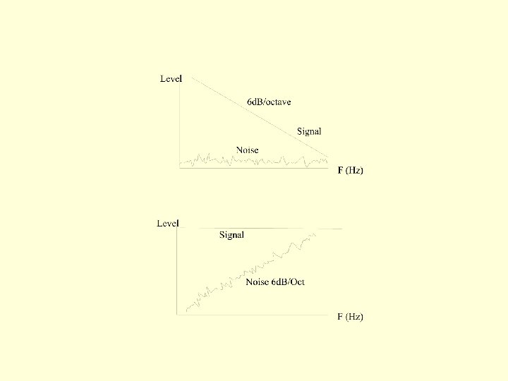 The signal output from a DPCM falls at 6 d. B/octave compared to a PCM signal. (it is limited by the slew rate). The noise floor due to quantization error and dither is constant across all frequencies. Obviously, this signal roll off (shown right above) is undesirable, so the signal is integrated (shown below right). This tilts the noise floor, so noise is greater at high frequencies - hence the sigma DPCM converters are known as noise shaping converters. This will be exploited in the oversampling systems we will discuss.