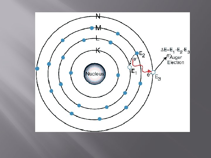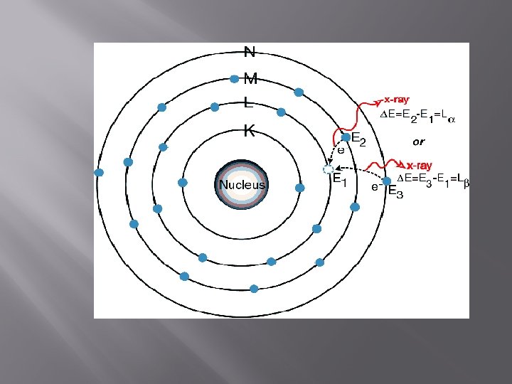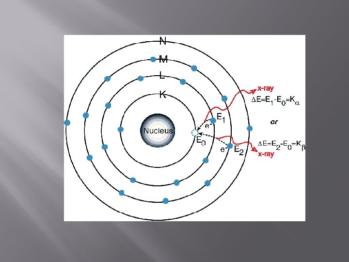 Summary of XRF 1. Sample bombarded by external primary excitation. 2. The high energy of the gamma ray engenders the ejection of an electron from the innermost orbital (labeled K) of an atom. At this point the atom is rendered unstable. 3. As an electron from the orbital L or orbital M fills the vacancy in orbital K, the electrons give off a characteristic x ray. 4. Meanwhile a vacancy has occurred in orbital L or orbital M, and the electrons in orbital M or orbital N fill in the vacancy. Giving off another unique x ray.