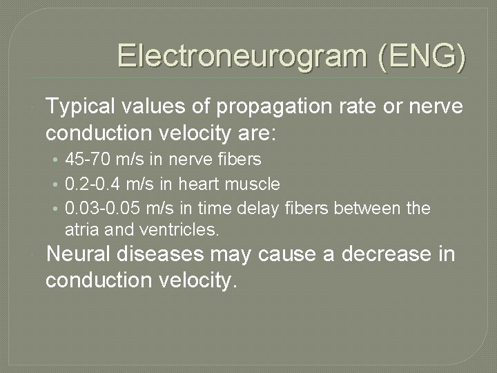 Electroneurogram (ENG) Typical values of propagation rate or nerve conduction velocity are: • 45 -70 m/s in nerve fibers • 0. 2 -0. 4 m/s in heart muscle • 0. 03 -0. 05 m/s in time delay fibers between the atria and ventricles. Neural diseases may cause a decrease in conduction velocity.