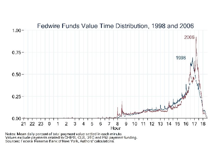 Five stylized changes in the Fedwire Funds value time distribution 1998 to 2006 1. The distribution of value settled became more concentrated and less variable. 2. The highest peak of activity is later. 3. Three distinct peaks, 16: 30, 17: 00, and the third (the sharpest) at 17: 11. 4. The 1998 distribution exhibits regular clock effects which virtually disappear in 2002. 5. The 2006 distribution shows higher activity at 08: 00 and 08: 30, and the 08: 00 peak is only present in 2006.