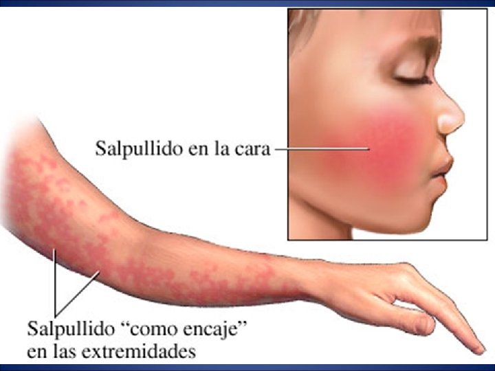 Incubación: 4 - 14 días. Periodo de contagio: Desde antes del comienzo de la erupción hasta la aparición de la erupción. Signos y síntomas: Febrícula, malestar. Artralgias ocasionales. El virus afecta a los precursores de los eritrocitos de la M. O. y produce disminución de los reticulocitos. Erupción: Aparece al 3º-4º día tras los pródromos - Localización: Comienza en las mejillas con placas edematosas (Cara abofeteada), se extiende a los brazos, las piernas y el tronco. - Características: Maculopapulosa, a menudo parcheada o reticular. - Duración: Dura 3 - 30 días (Media de 11 días) Puede recidivar durante varias semanas.