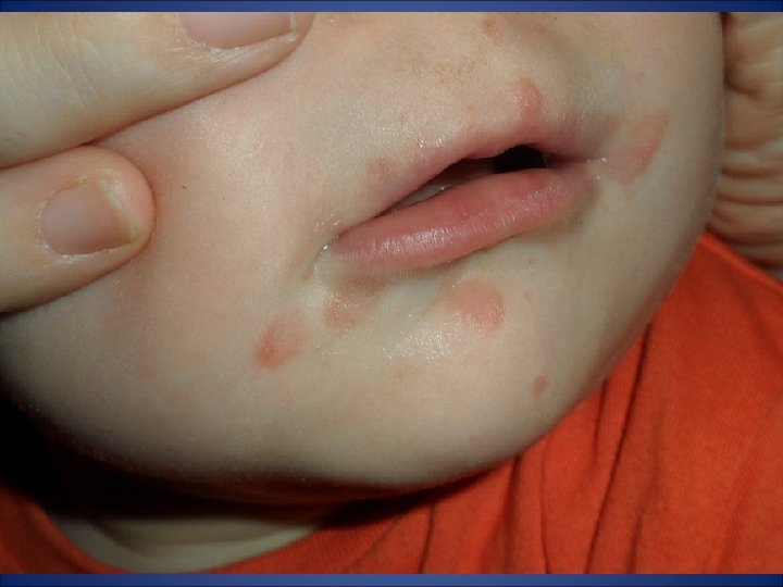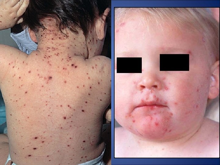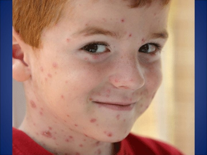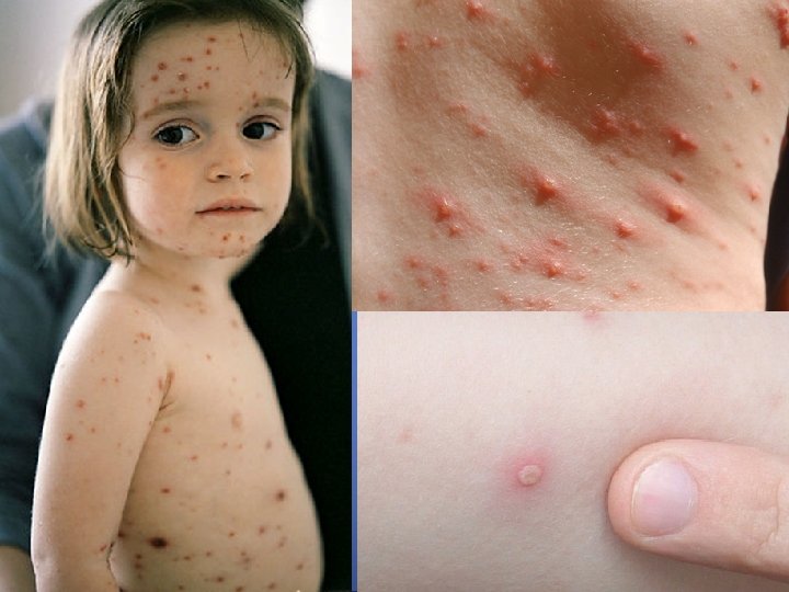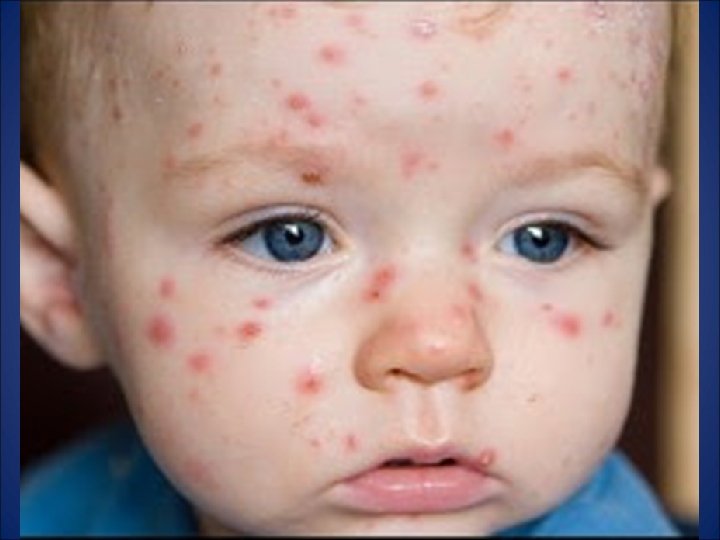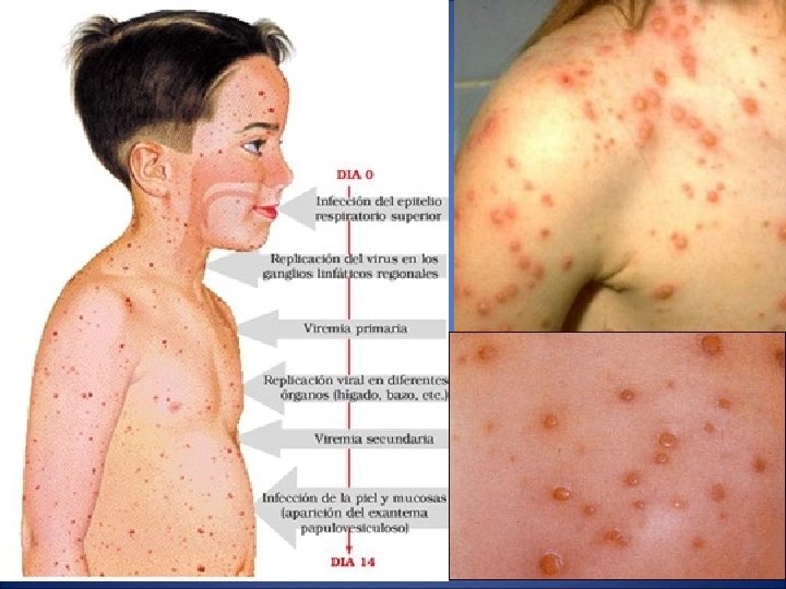 Incubación: 14 – 21 días. Periodo de contagio: Desde 3 días antes de la aparición del exantema hasta que las lesiones sean costras. Signos y síntomas: Catarro leve, fiebre moderada, exantema vesicular generalizado y pruriginoso. Erupción: - Localización: Tronco, cara, cuero cabelludo y luego se generaliza - Características: Elementos en todos los estadios ( maculas, pápulas, vesículas y costras) - Comienzo y duración: El exantema aparece a los 24 – 48 h. de comenzar el malestar, se producen unas 3 oleadas de elementos maculares que evolucionan produciendo el típico aspecto de “cielo estrellado”. Dura entre 7 -10 días. Tratamiento: Aziclovir: 80 mgrs/kg/dia 5 días
