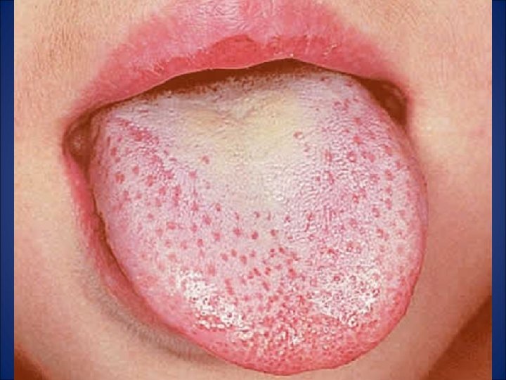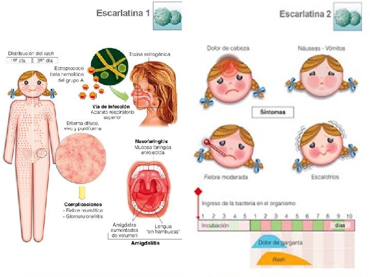 Incubación: 2 – 7 días. Contagio: Hasta 48 horas tras antibioterapia. Signos y síntomas: Amigdalitis aguda, fiebre alta hasta 40ºC, adenopatías, lengua saburral, facies de Filatow, lengua aframbuesada, enantema palatino petequial. Erupción: Aparece a las 12 -48 h tras inicio fiebre. -Localización: se inicia ingles y axilas y se extiende a bajo vientre, pecho y espalda y luego a los miembros. Predomina en pliegues. La cara presenta enrojecimiento en frente y mejillas y palidez perioral. No afecta a palmas ni plantas. -Características: micropapular, como en papel de lija. -Comienzo y duración: Aparece entre las 12 y 48 horas del comienzo del fiebre y se generaliza en 24 horas. El exantema se mantiene 4 – 6 días y luego aparece la descamación que puede durar 3 semanas. - Tratamiento: Amoxicilina : 50 mgrs/kg/dia 10 días.