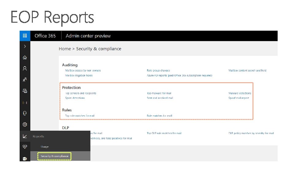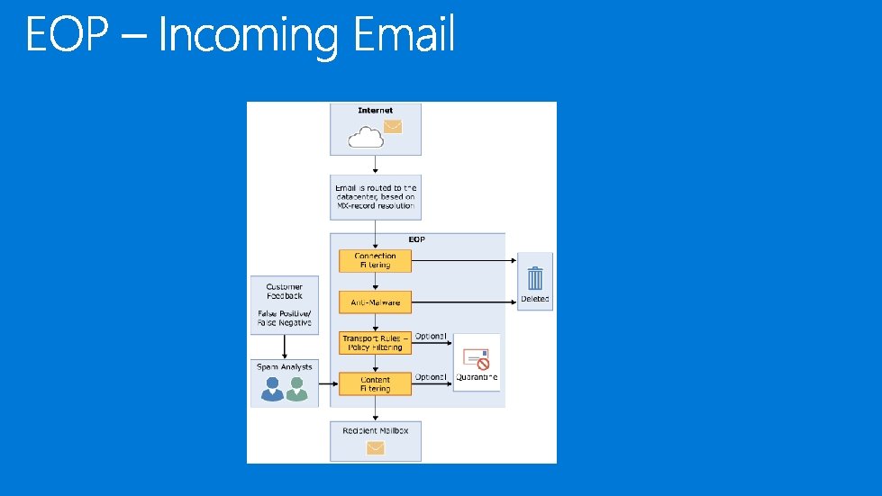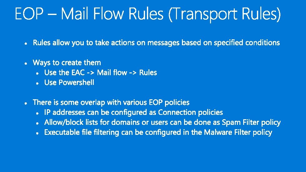 1. 2. 3. 4. 5. 6. Viruses are NOT quarantined Spam is quarantined for 15 days (default) Messages quarantined by transport rule are kept for 7 days. Users cannot access the transport-rule quarantine Options are to release to all/specific recipients, plus report as false-positive Messages stay after release until they expire, but cannot be released to same user twice § § § Online viewer only supports up to 500 messages More can be viewed via Power. Shell Get-Quarantine. Message Cmdlet Can only release in bulk through Release-Quarantine. Message Cmdlet