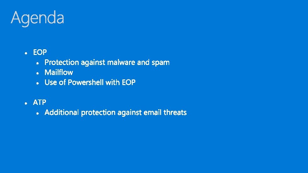 What is Advanced Threat Protection? • 2 features: • Safe Attachments – scans files after normal malware scan to inspect behaviour • Safe Links – links are redirected in mails to ATP in realtime. ATP inspects the URL and can block it, if found to be malicious. • New reporting: URL Trace • Policies to include desired users/groups. • Service is provided at additional cost • $2/user/month; “most competitive rate in the industry”