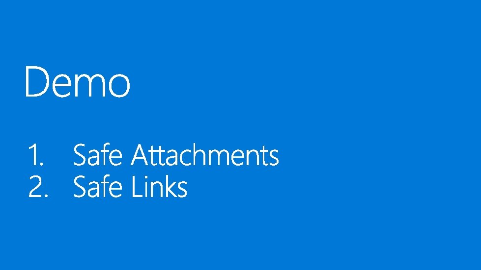 Sender Detonation chamber (sandbox) Executable? Registry call? Elevation? ……? Unsafe Multiple filters + 3 antivirus engines with Exchange Online protection Attachment • Supported file type • Clean by AV/AS filters • Not in Reputation list Links Safe Recipient Safe links rewrite