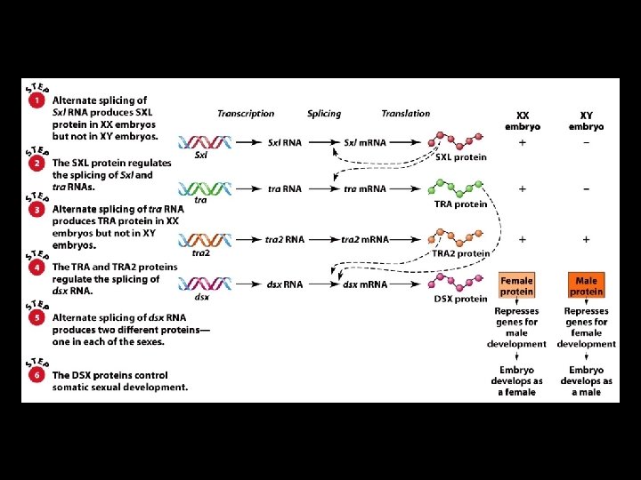 Differentiating in Response to the Signal 4 TRA, along with TRA 2, regulate splicing of doublesex (dsx) and fruitless (fru). 4 In XX embryos, where TRA is present, dsx transcripts are processed to encode a DSX protein that represses the genes for male development. 4 In XY embryos, where TRA is absent, dsx transcripts are processed to encode a DSX protein that represses the genes for female development.