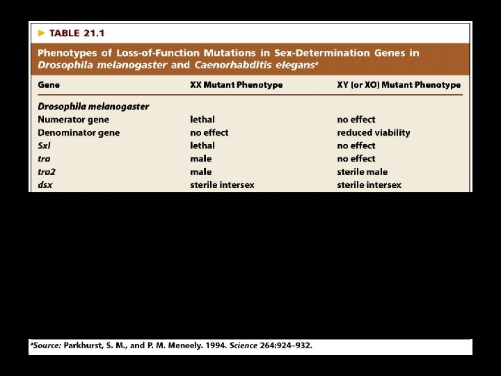 Sex Determination in Drosophila and C. elegans 4 The sex determination signal in both animals is the ratio of X chromosomes to autosomes. If the ratio is 1. 0 or greater, the animal is a female; if the ratio is 0. 5 or less, the animal is a male. CLASSIC Definition 4 But wrong 4 In Drosophila, the key genes in sex determination encode proteins that regulate RNA processing.