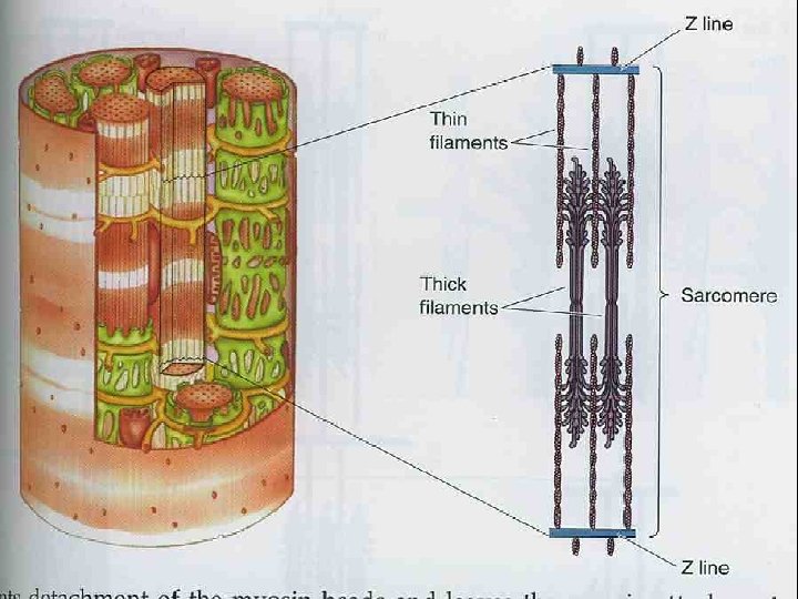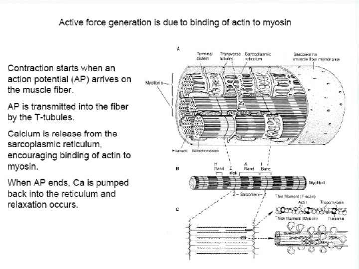 General mechanism of contraction Introduction : Muscle fibers cells are connected with connective tissue. When the muscle fibers shortens, the pull is , there fore transmitted through the connective tissue to the bone and there in flexion / extension etc movement of the joint. Finer details : at rest is when the muscle is in a state of relaxation : 1. H- zone is wide 2. I- bands are wide ( because good deal of thin filament is not overlapped by the thick filament in the