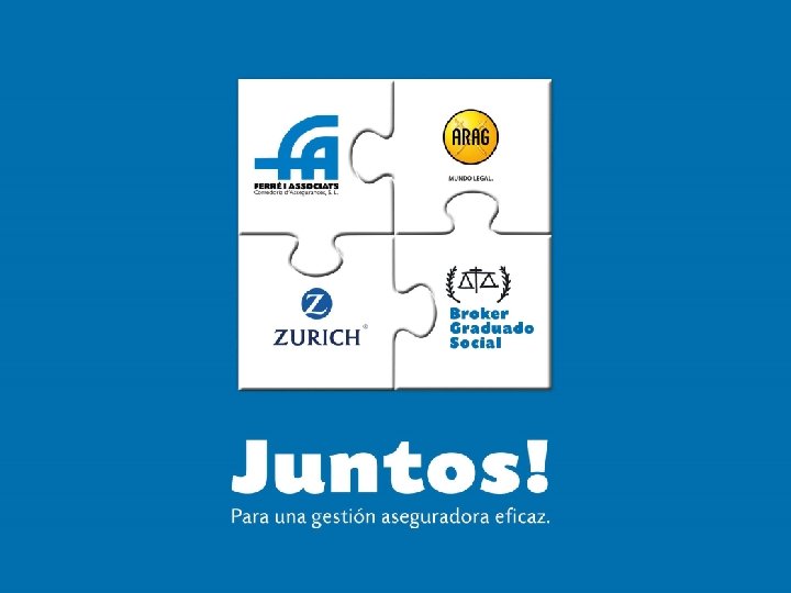 ZURICH Aseguradora puntera a nivel mundial y con plena implantación en nuestro mercado. Su póliza se formaliza a través de Zurich Global Corporate Spain, entidad con sede en Barcelona dedicada única y exclusivamente a grandes contratos que precisan de un trato específico y personalizado. ARAG Primera compañía de defensa jurídica en España. Cuenta con más de 8 millones de clientes y aporta a nuestro contrato servicios de valor añadido. Especial mención al Contraseguro, cobertura más que aconsejable para una póliza colectiva.
